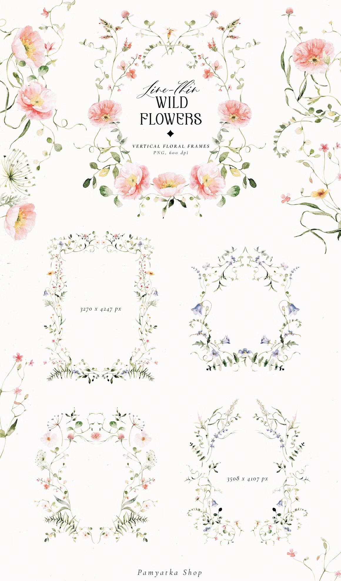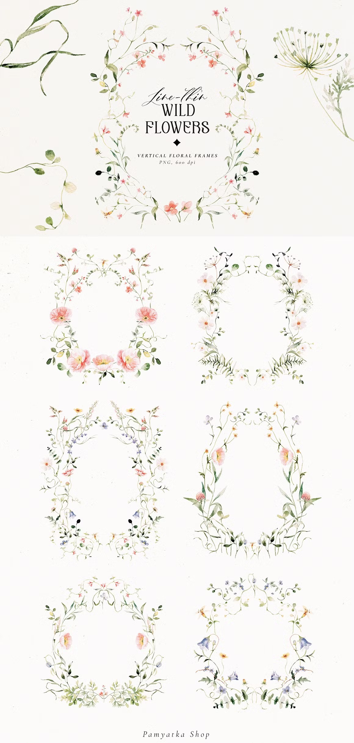 #160 – Hoa cỏ mùa xuân – Hoa mùa xuân – Thiệp cưới mùa xuân – Khung hoa – Bó hoa – Mùa xuân – Hoa vẽ màu nước